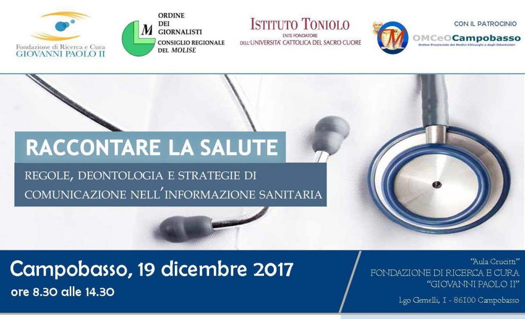 Diritto all’informazione e tutela della privacy in sanità, prospettive social ed etica della comunicazione, le principali regole deontologiche nel racconto della salute sono alcuni dei temi che verranno approfonditi in occasione del corso di formazione professionale presso la Fondazione di Ricerca e Cura Giovanni Paolo II di Campobasso. Locandina