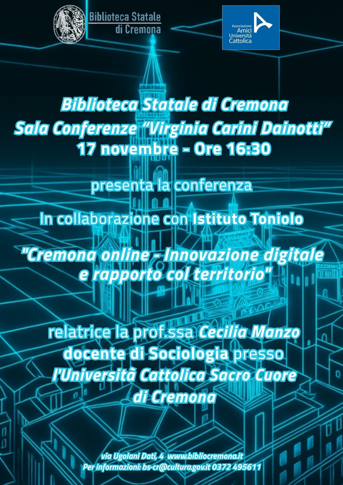 Lunedì 17 novembre 2025 presso la Biblioteca Statale di Cremona è in calendario una conferenza sul tema Cremona online – Innovazione digitale e rapporto col territorio, in collaborazione con l’Associazione Amici dell’Università Cattolica. Interverrà la prof. Cecilia Manzo, docente di Sociologia dei processi economici e del lavoro presso l’Ateneo del Sacro Cuore.