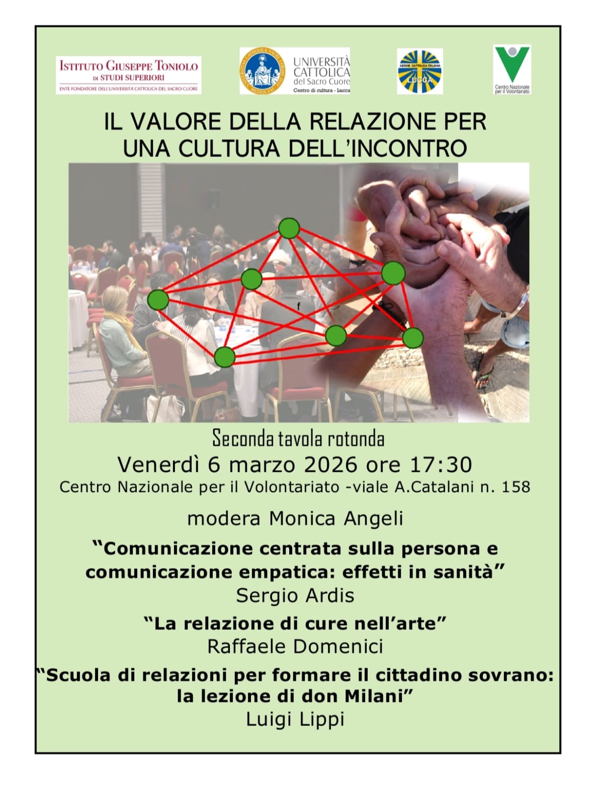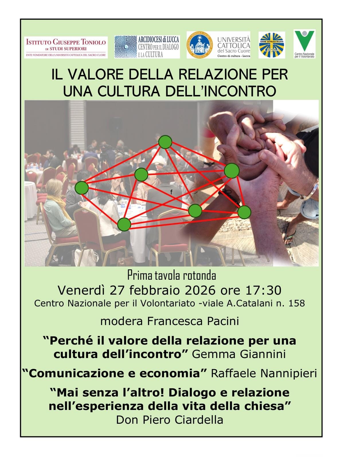 Venerdì 27 febbraio presso il Centro nazionale per il Volontariato di Lucca si è tenuto il primo incontro dedicato al tema Il valore della relazione per una cultura dell’incontro, promosso dal Centro di cultura dell’Università Cattolica assieme a Istituto Toniolo, Centro per la cultura e il dialogo dell’Arcidiocesi di Lucca, Azione Cattolica. Gemma Giannini, delegata diocesana e presidente del Centro di Cultura dell’Università Cattolica, ha introdotto i lavori sottolineando l’importanza dell’ascolto e della cura delle relazioni per costruire fiducia, empatia e comunità solide. Praticare un ascolto attivo e autentico significa andare oltre la superficie per comprendere profondamente i bisogni degli altri. A seguire, Raffaele Nannipieri, laureato in Economia e commercio presso l’Università di Pisa, ha sottolineato la necessità che la comunicazione economica si fondi su trasparenza e veridicità. Un approccio etico, basato su dati chiari e accessibili, riduce i rischi di incertezza, costruisce fiducia e reputazione, e consente scelte consapevoli. Ha concluso don Piero Ciardella, direttore del Centro per la cultura e il dialogo dell’Arcidiocesi, esplorando il tema del dialogo e della relazione nell’esperienza di vita della Chiesa.