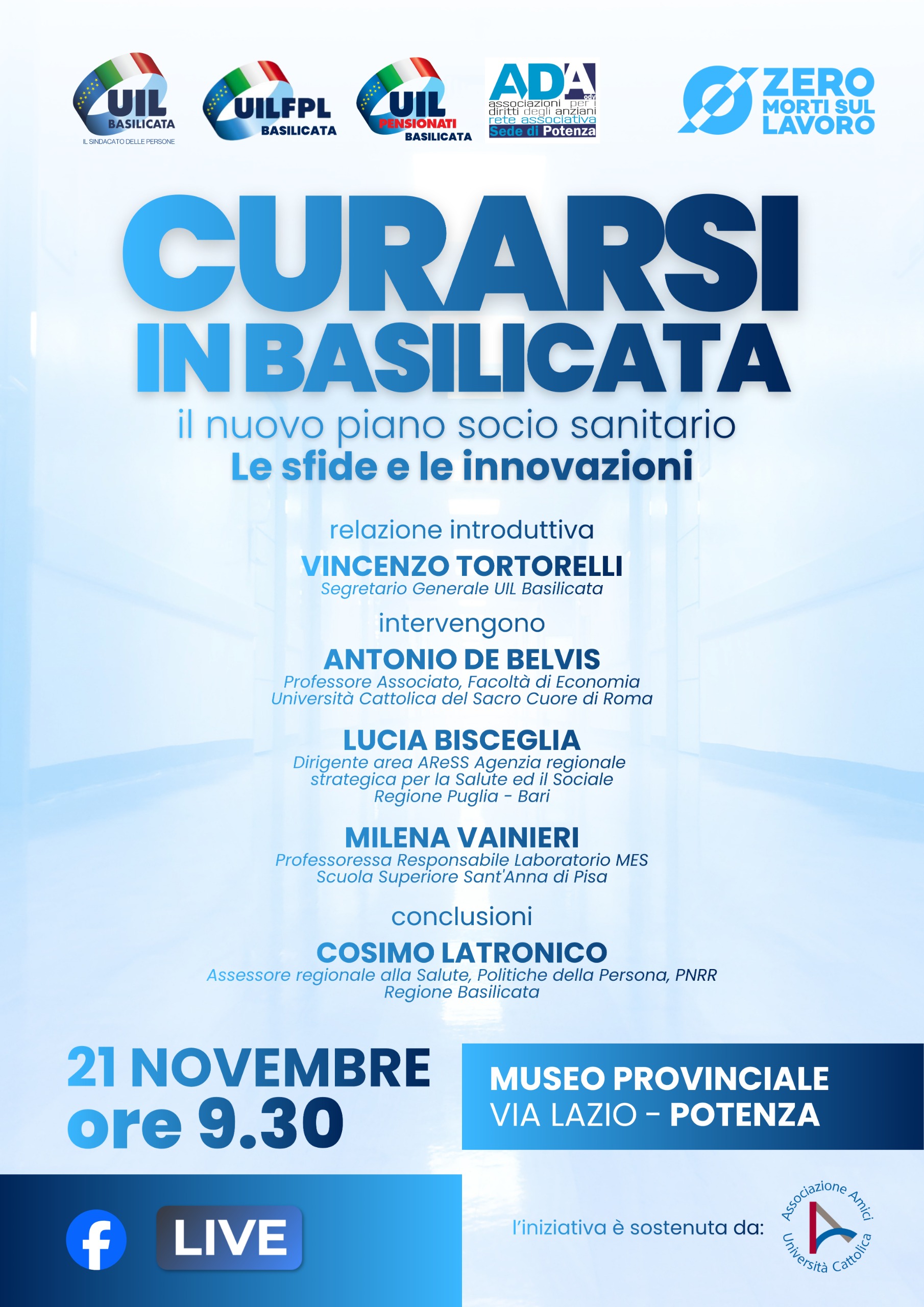 Curarsi in Basilicata è il titolo di un convegno promosso dal sindacato UIL Basilicata in collaborazione con altre realtà del territorio, in calendario venerdì 21 novembre 2025 al Museo Provinciale di Potenza. Interverranno: Antonio De Belvis, medico epidemiologo e docente di Igiene e Sanità pubblica presso il Dipartimento di Scienze dell’economia e della gestione aziendale dell’Università Cattolica di Roma; Lucia Bisceglia, dirigente per l’Agenzia regionale strategica per la salute e il sociale della Puglia; Milena Vainieri, docente responsabile del Laboratorio di Management e Sanità presso la Scuola superiore Sant’Anna di Pisa. Le conclusioni sono affidate a Cosimo Latronico, Assessore regionale alla salute, politiche della persona e PNRR della Basilicata.