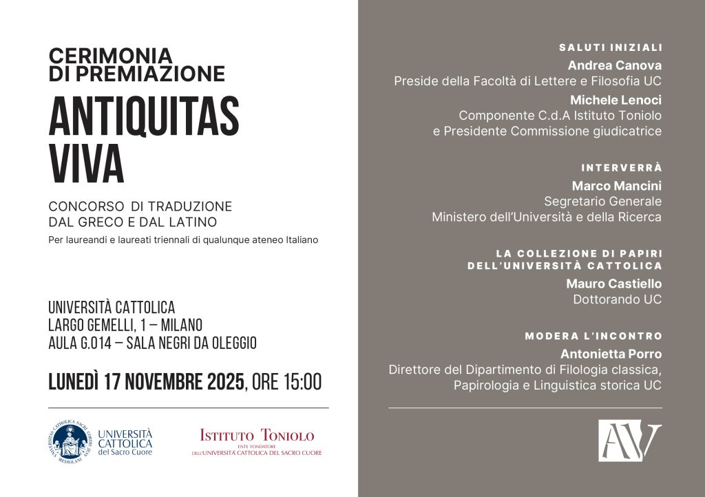 Lunedì 17 novembre 2025 alle ore 15.00 presso la sede di Milano dell’Università Cattolica si terrà la Cerimonia di premiazione dei vincitori del Concorso di traduzione dal greco e dal latino Antiquitas viva.