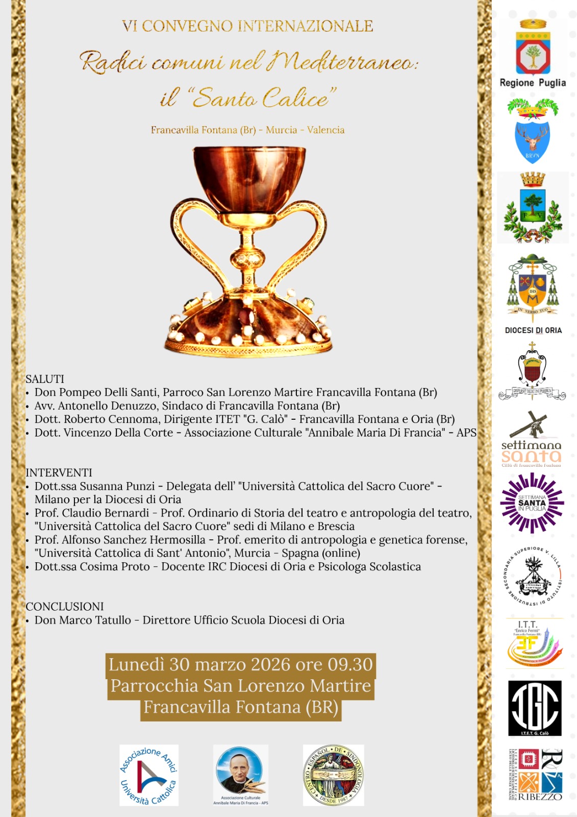 Lunedì 30 marzo l’Associazione culturale “Annibale Maria Di Francia”, in collaborazione con l’Associazione Amici dell’Università Cattolica e l’ITET “G. Calò”, ha organizzato il VI Convegno internazionale Radici comuni nel Mediterraneo: il “Santo Calice” a Francavilla Fontana (BR) per riflettere sui riti e i simboli della Settimana Santa. I popoli del Mediterraneo da millenni si influenzano e dialogano intorno ai temi esistenziali della vita, della morte e del pellegrinaggio come metafora della vita che diviene ricerca spirituale e desiderio di fratellanza universale.