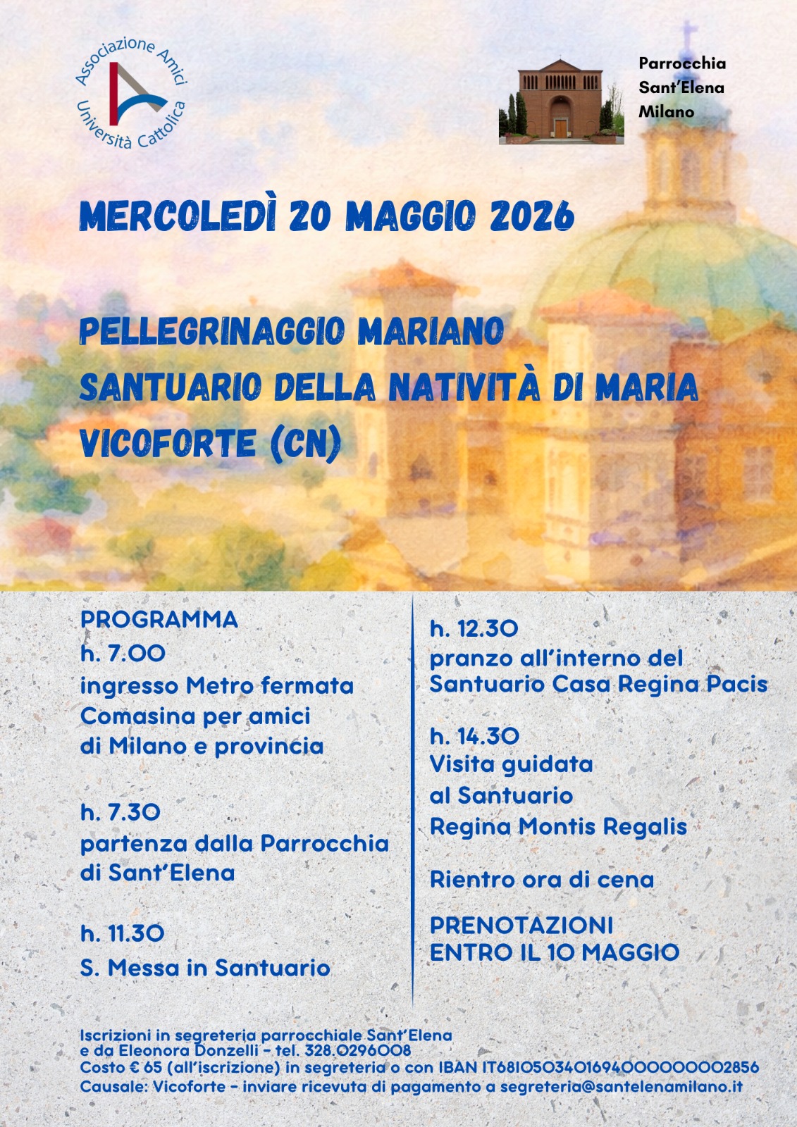 La Delegazione diocesana di Milano invita al pellegrinaggio mariano che si terrà mercoledì 20 maggio 2026 presso il Santuario della Natività di Maria a Vicoforte (CN). Primario luogo di spiritualità e fulcro della diocesi di Mondovì, il Santuario è stato costruito attorno alla sacra immagine della “Madonna del pilone di Vico”. L’icona, dipinta ad affresco su un pilone campestre, raffigura la Madre di Dio con il Bambino in grembo. Dal 1682, data della prima incoronazione, la Madonna è invocata con il titolo di Regina Montis Regalis.