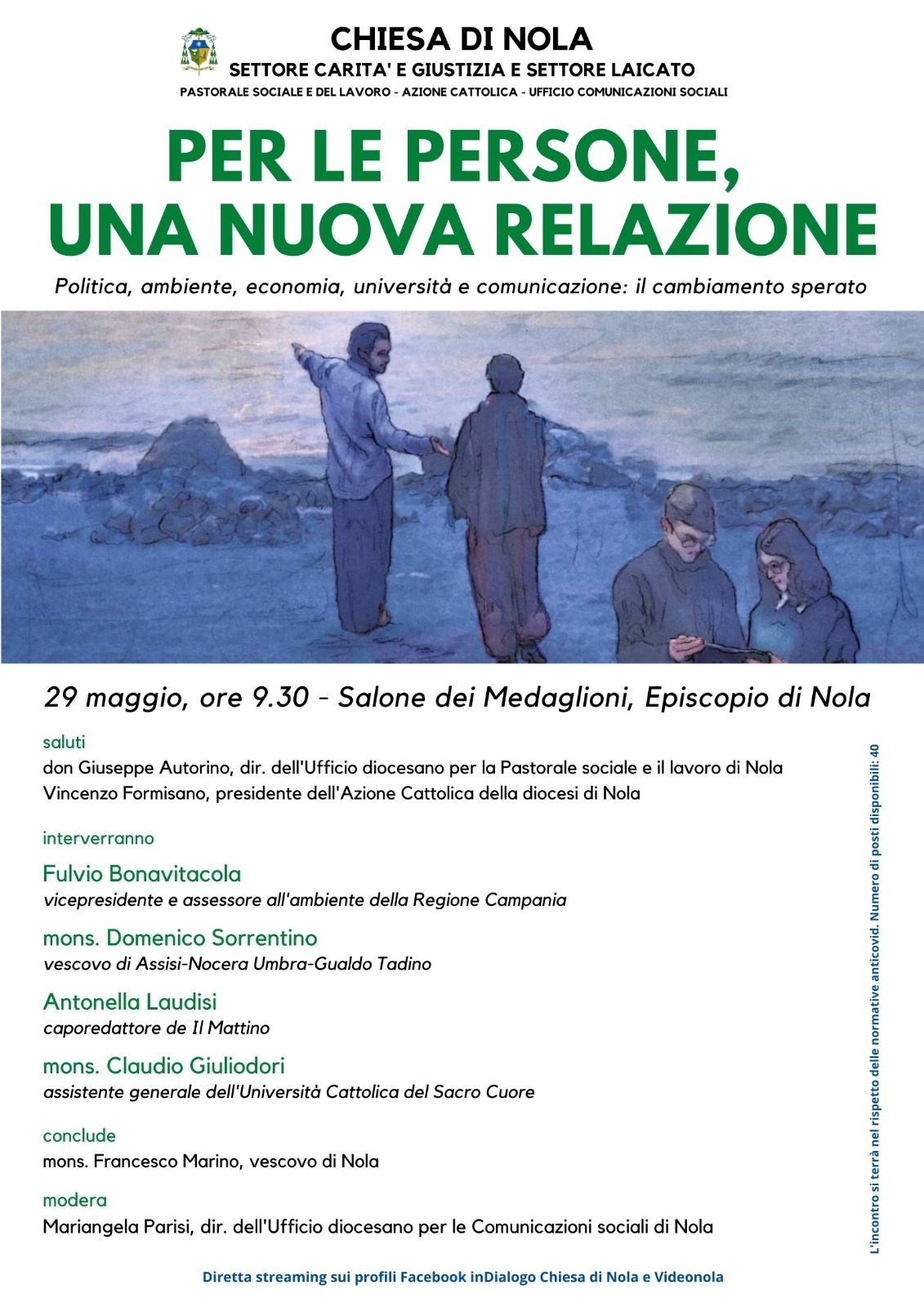 Sabato 29 maggio, presso il Salone dei Medaglioni del Palazzo vescovile di Nola, si è approfondito il tema: Per le persone, una nuova relazione. Politica, ambiente, economia, università e comunicazione: il cambiamento sperato.
