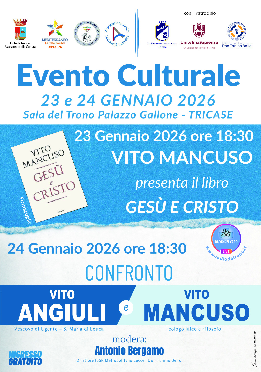 Venerdì 23 gennaio 2026 presso la Sala del Trono di Palazzo Gallone a Tricase è stato presentato il volume, edito da Garzanti, e il giorno successivo si è tenuto un confronto tra mons. Vito Angiuli, Vescovo di Ugento – Santa Maria di Leuca, e Vito Mancuso aperto alla cittadinanza. Moderatore Antonio Bergamo, direttore dell’Istituto metropolitano “Don Tonino Bello”. A introdurre i lavori, in entrambe le occasioni, Mimmo Turco, delegato diocesano dell’Università Cattolica.