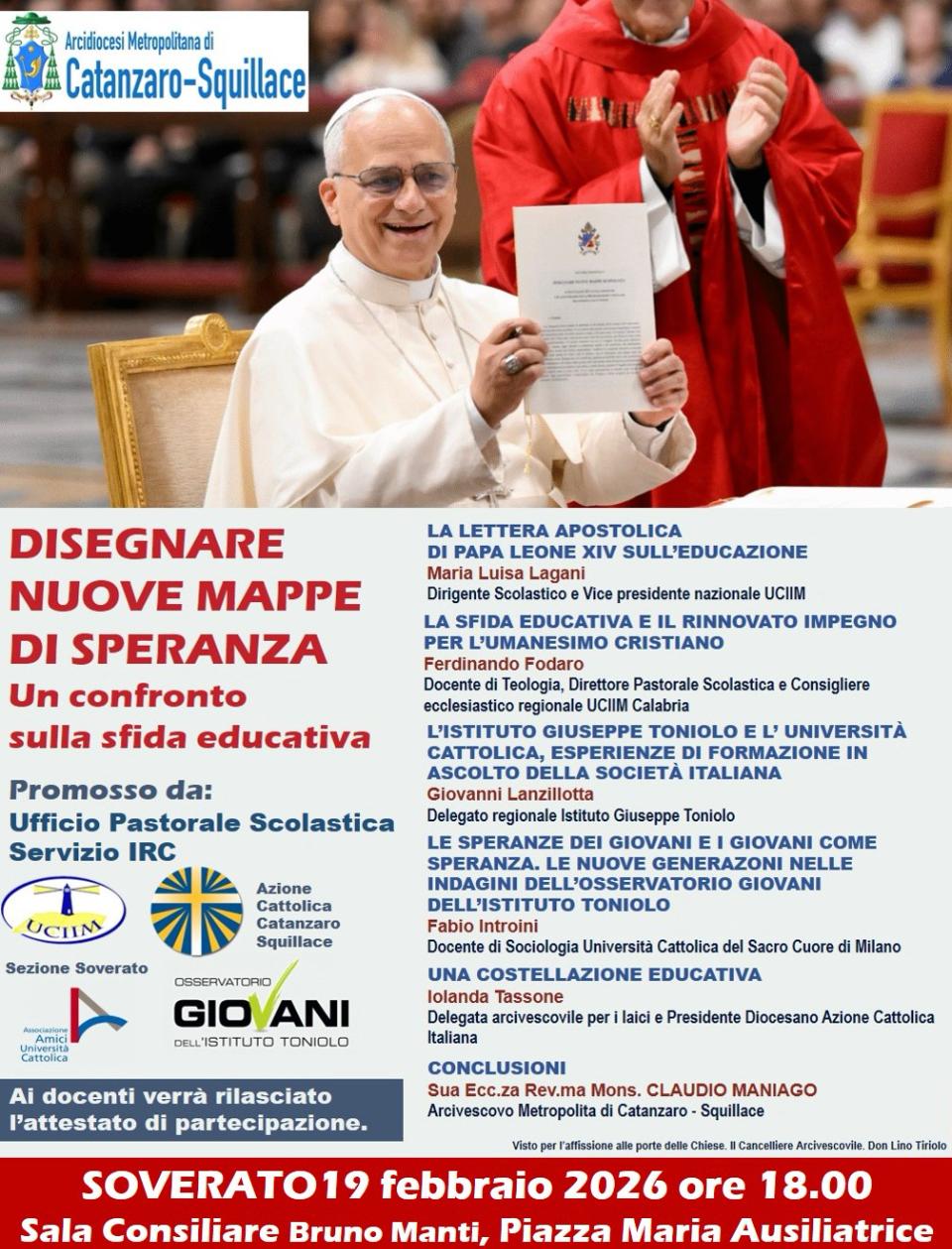 Giovedì 19 febbraio 2026 l’Ufficio Pastorale Scolastica – Servizio I.R.C. dell’Arcidiocesi metropolitana di Catanzaro-Squillace promuove a Soverato un incontro di riflessione e dialogo sul futuro dell’educazione, a sostegno del mondo della scuola e per valorizzare il ruolo delle nuove generazioni nella società contemporanea, sul tema “Disegnare nuove mappe di speranza. Un confronto sulla sfida educativa”. Verrà presentata la recente lettera apostolica di Papa Leone XIV, scritta in occasione del 60° anniversario della dichiarazione conciliare Gravissimum educationis, dedicata proprio all’ambito educativo e interverrà S.E. mons. Claudio Maniago, Arcivescovo metropolita, a suggello di un incontro che si preannuncia significativo per docenti, educatori e operatori pastorali. Ai docenti partecipanti verrà rilasciato un attestato di partecipazione.