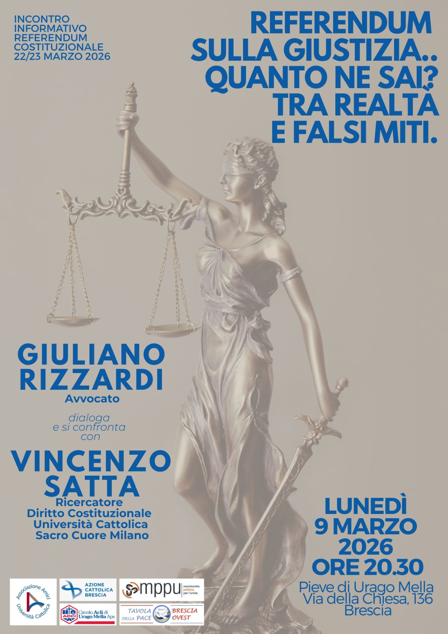 Alcune associazioni territoriali della zona ovest della città di Brescia (Azione Cattolica, ACLI, Tavola della pace, Movimento politico per l’Unità), in collaborazione con l’Associazione Amici dell’Università Cattolica, promuovono un incontro informativo sulle tematiche referendarie del 22-23 marzo 2026. L’incontro si svolgerà lunedì 9 marzo presso la Pieve di Urago Mella.